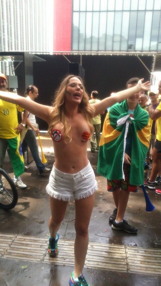 Socialite ‘faz a desinibida do protesto’ e sai às ruas com adesivos nos seios