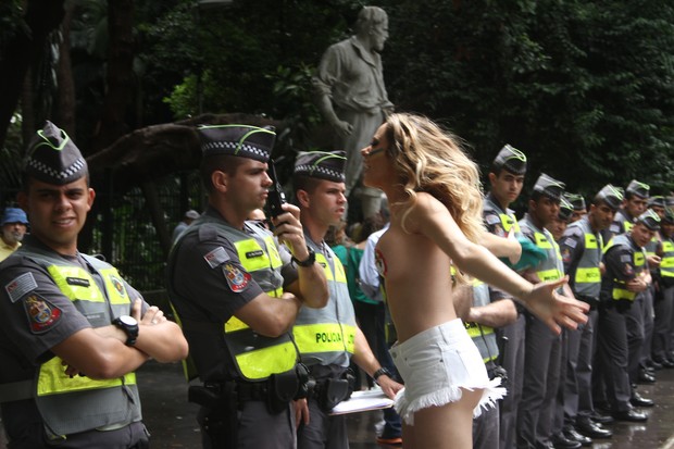 Socialite ‘faz a desinibida do protesto’ e sai às ruas com adesivos nos seios