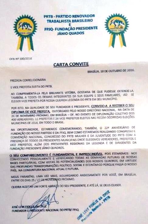 Baby recebe convite para participar da Convenção Nacional do PRTB e receber diploma em Brasília