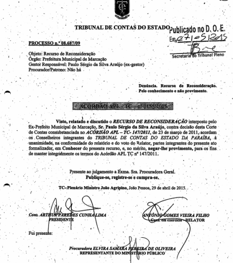 TCE dá prazo de 30 dias para ex-prefeito de Marcação devolver recursos a Prefeitura