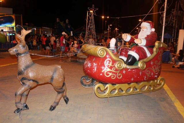 Vestido de Papai Noel, prefeito entrega presentes na abertura do Natal Iluminado de Rio Tinto