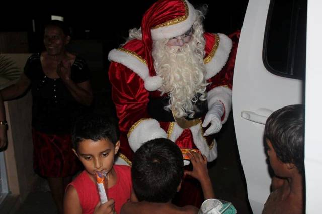 Vestido de Papai Noel, prefeito entrega presentes na abertura do Natal Iluminado de Rio Tinto