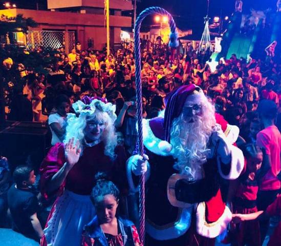 Vestido de Papai Noel, prefeito entrega presentes na abertura do Natal Iluminado de Rio Tinto