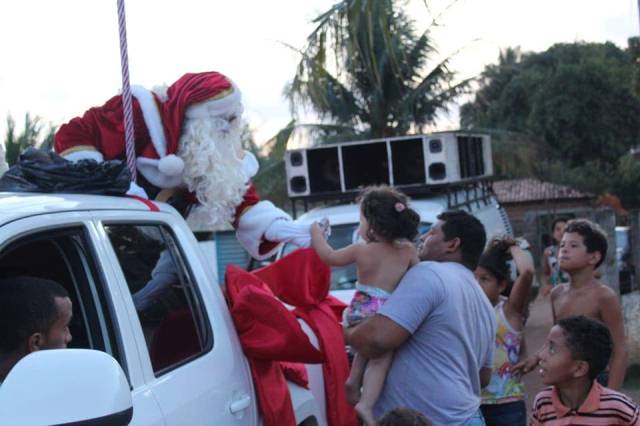Vestido de Papai Noel, prefeito entrega presentes na abertura do Natal Iluminado de Rio Tinto