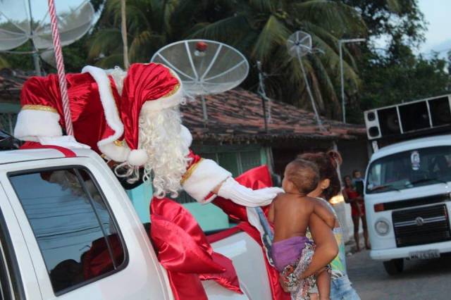 Vestido de Papai Noel, prefeito entrega presentes na abertura do Natal Iluminado de Rio Tinto